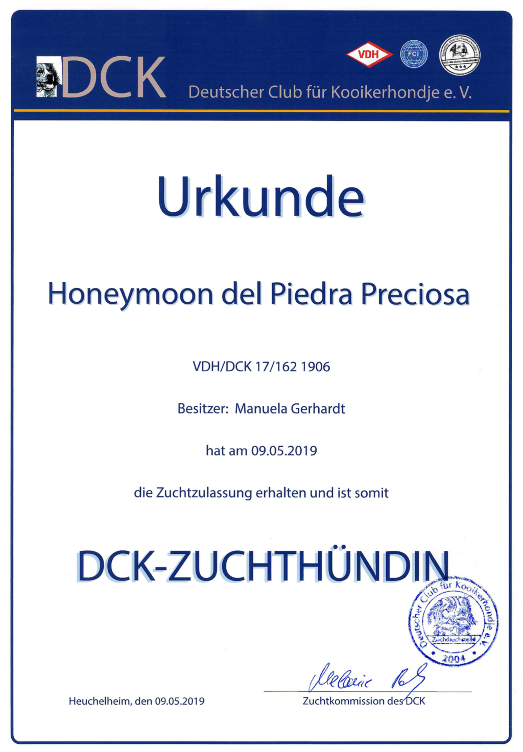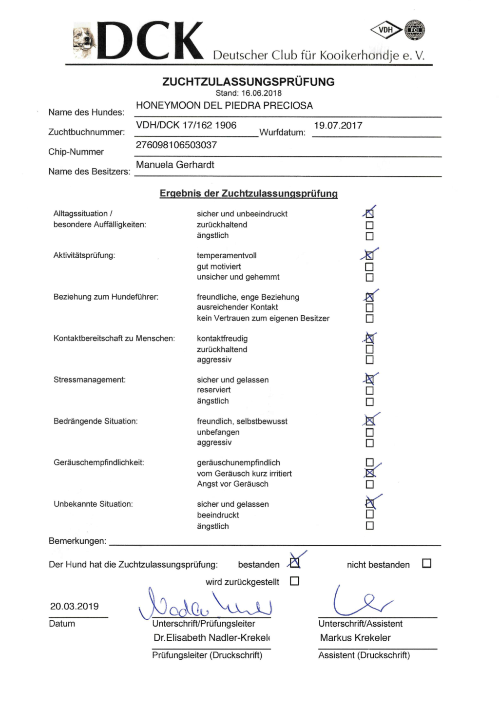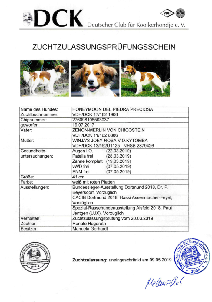 Zeta kümmerte sich rührend um sie. Die Rüden kümmerten sich mehr um sich. Mit der Zeit wuchs das Team zusammen und aus Honneymoon, Mooni oder Honey wurde eine freie, offene, sehr verschmuste und anhängliche Begleiterin, die ebenfalls dem Rassestandard so gut entsprach, dass sie mit vorzüglich bewertet wurde.