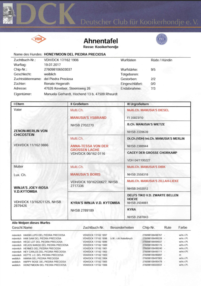 Im C-Wurf gebar sie 9 gesunde Welpen, sowie 7 Wonneproppen im D-Wurf. Im E-Wurf waren es sogar 11 Welpen, die alle gesund waren und nicht gepäppelt werden mussten. Unsere Honeymama ein Wunder der Natur mit soviel Instinktsicherheit, Liebe, Konsequenz und Geduld.